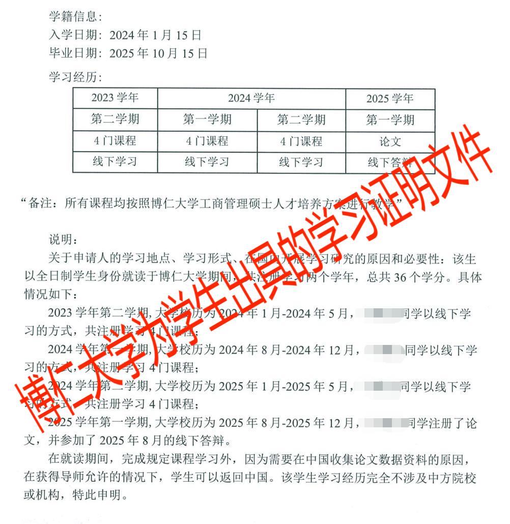 【最关键的是】:有没有真实出境记录,是否根据大学的教学计划完整参与学习过程(课程+论文),如图(博仁大学出具证明文件)