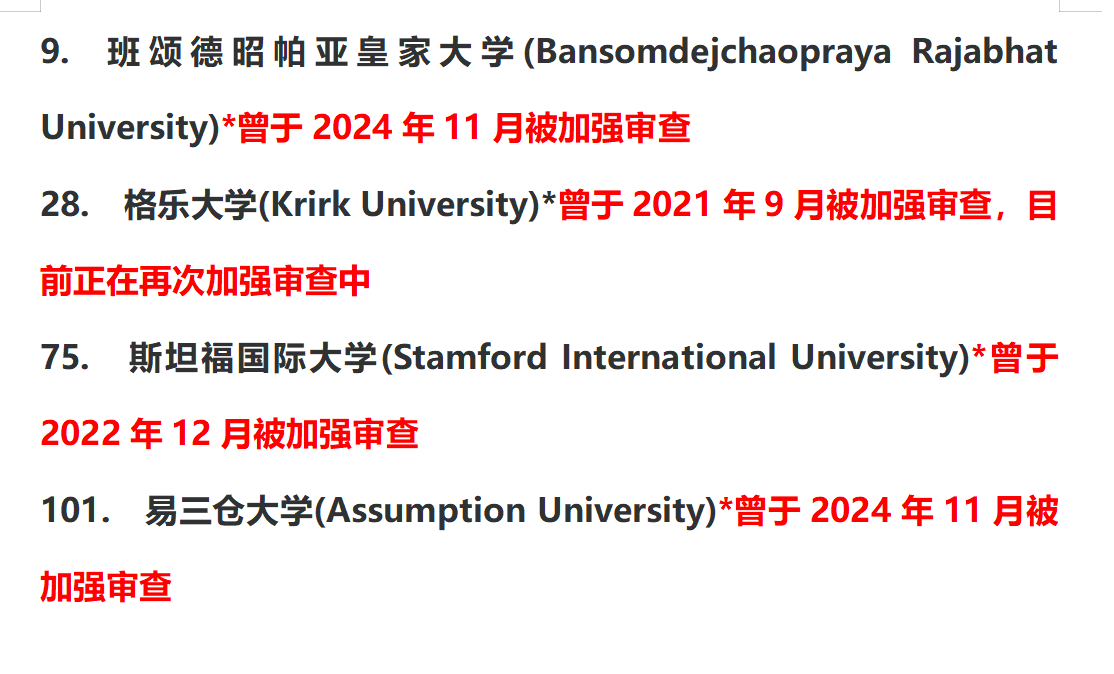 3、大学被中留服拉入黑名单,因为一些原因,当大学被拉入黑名单后,就会延长认证时间甚至不予认证。如图(目前泰国黑名单学校)